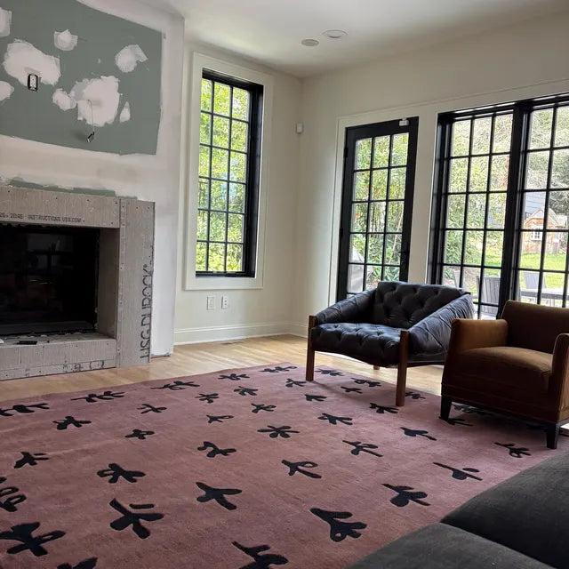 Modern Abstract Botanical Tufted Rug – Dusty Rose & Black Leaf Pattern Carpet