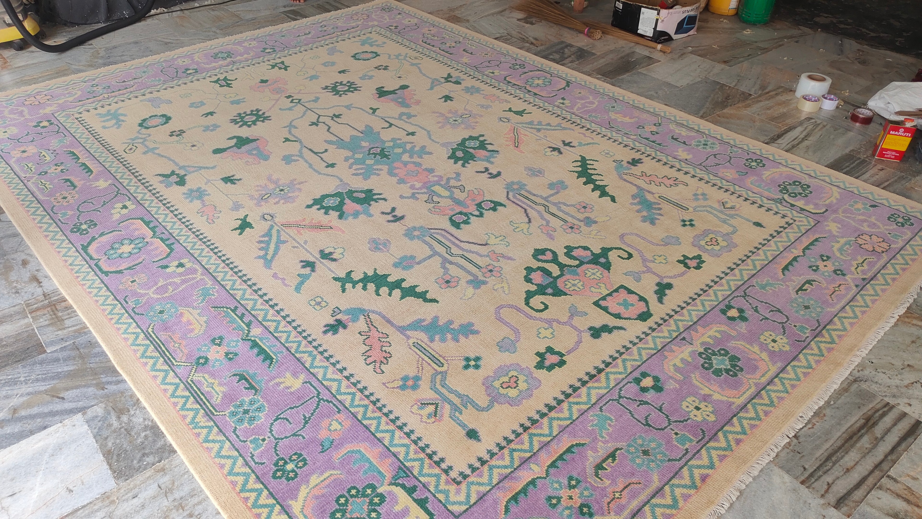 Beige Lavender Oushak Rug – Vintage Turkish Wool Carpet with Pastel Botanical Motifs