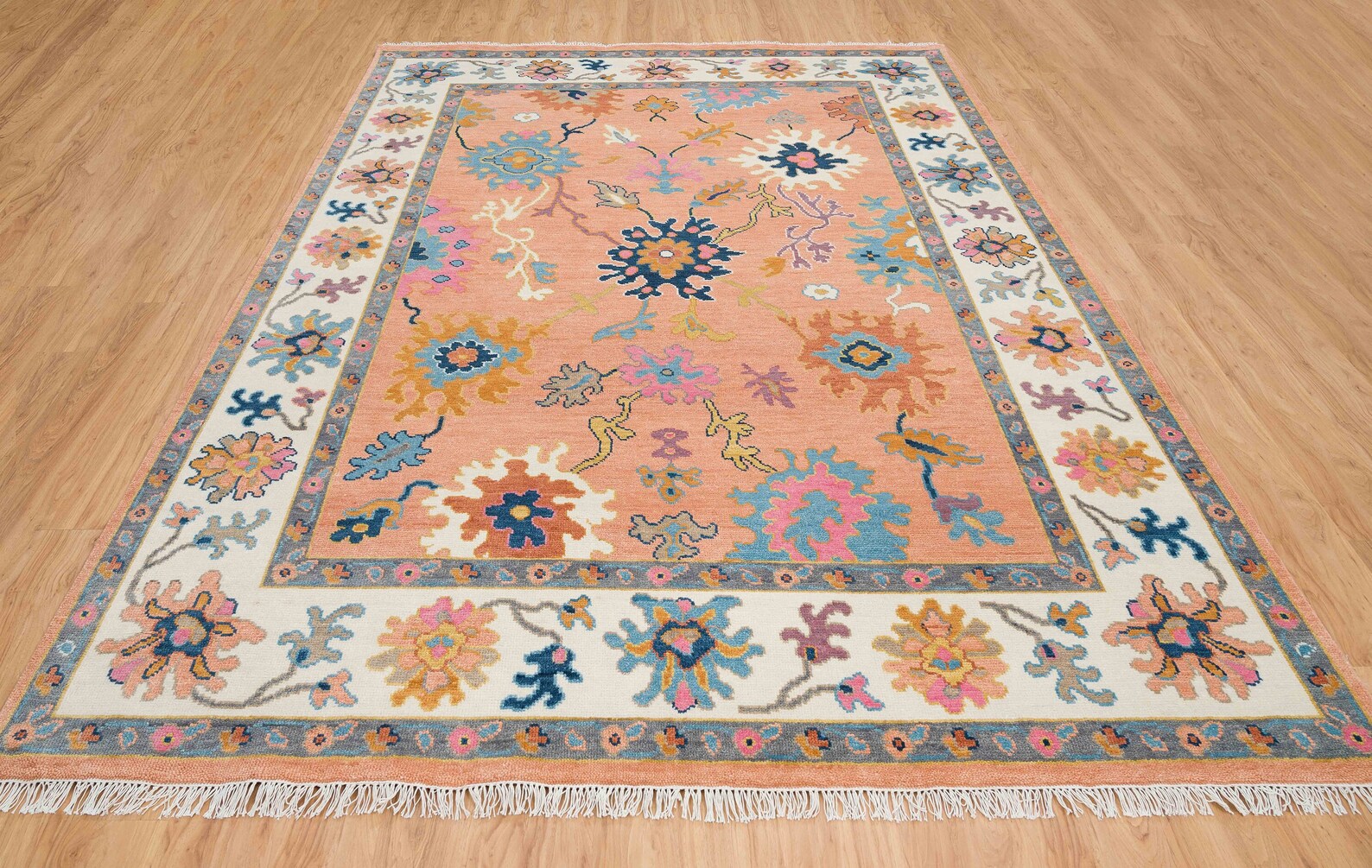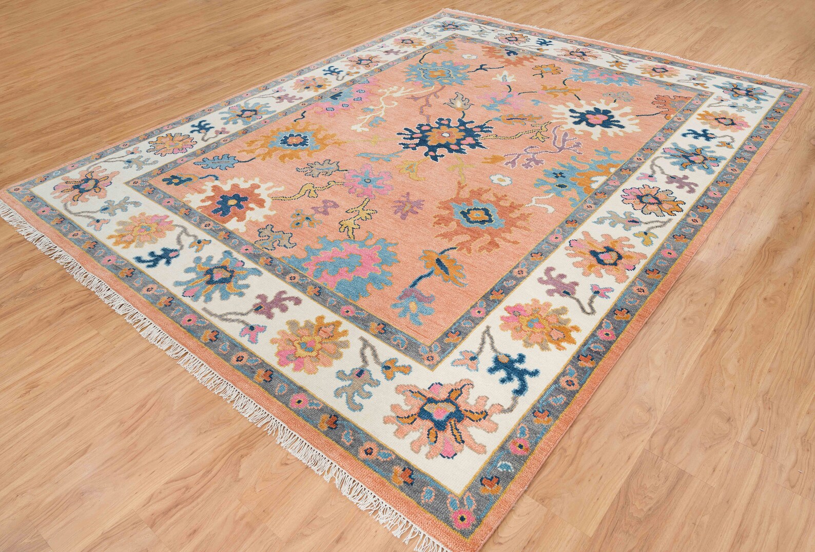 Contemporary Oushak Rug – Light Orange Wool Area Rug with Pink & Blue | Ivory Border Turkish Rug 8x10 / 9x12 for Modern Living Room
