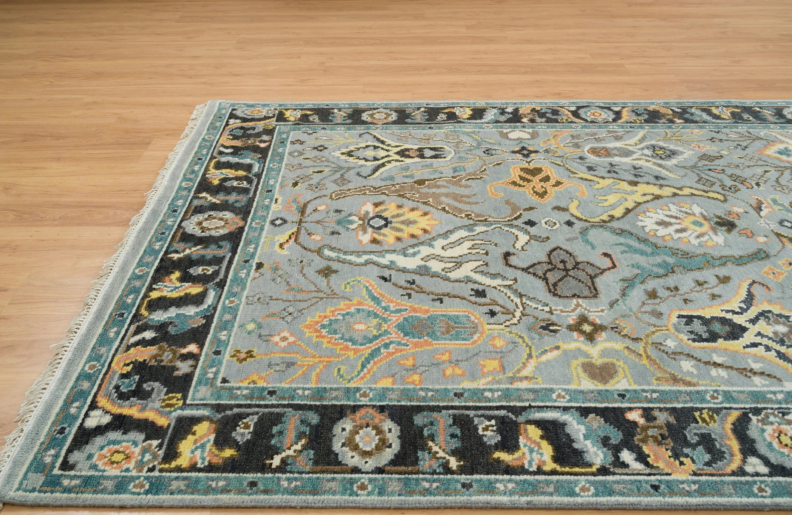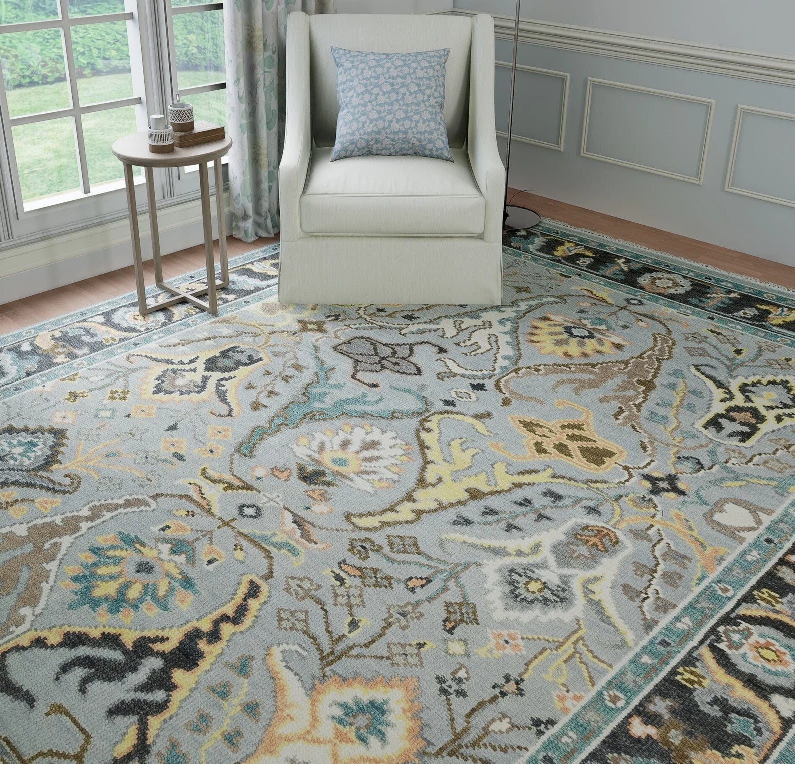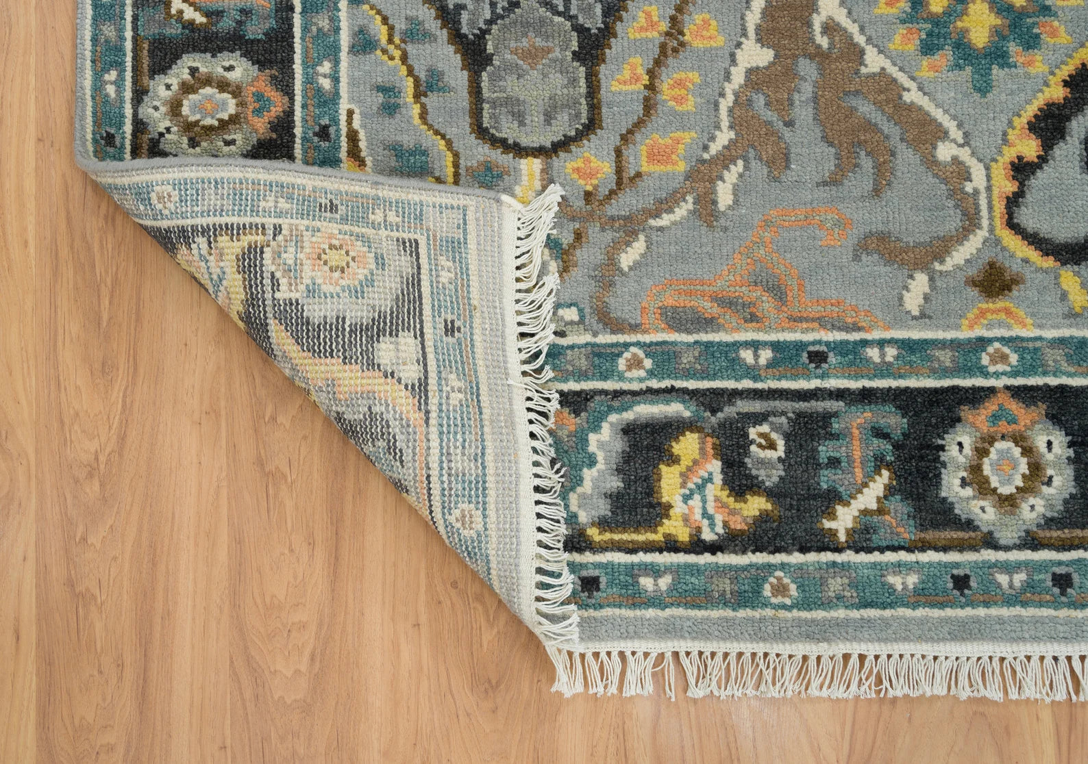 Fossil Gray Oushak Rug – Gold Accent Wool Area Rug | Teal, Ivory & Black Border Turkish Rug for Living Room or Bedroom