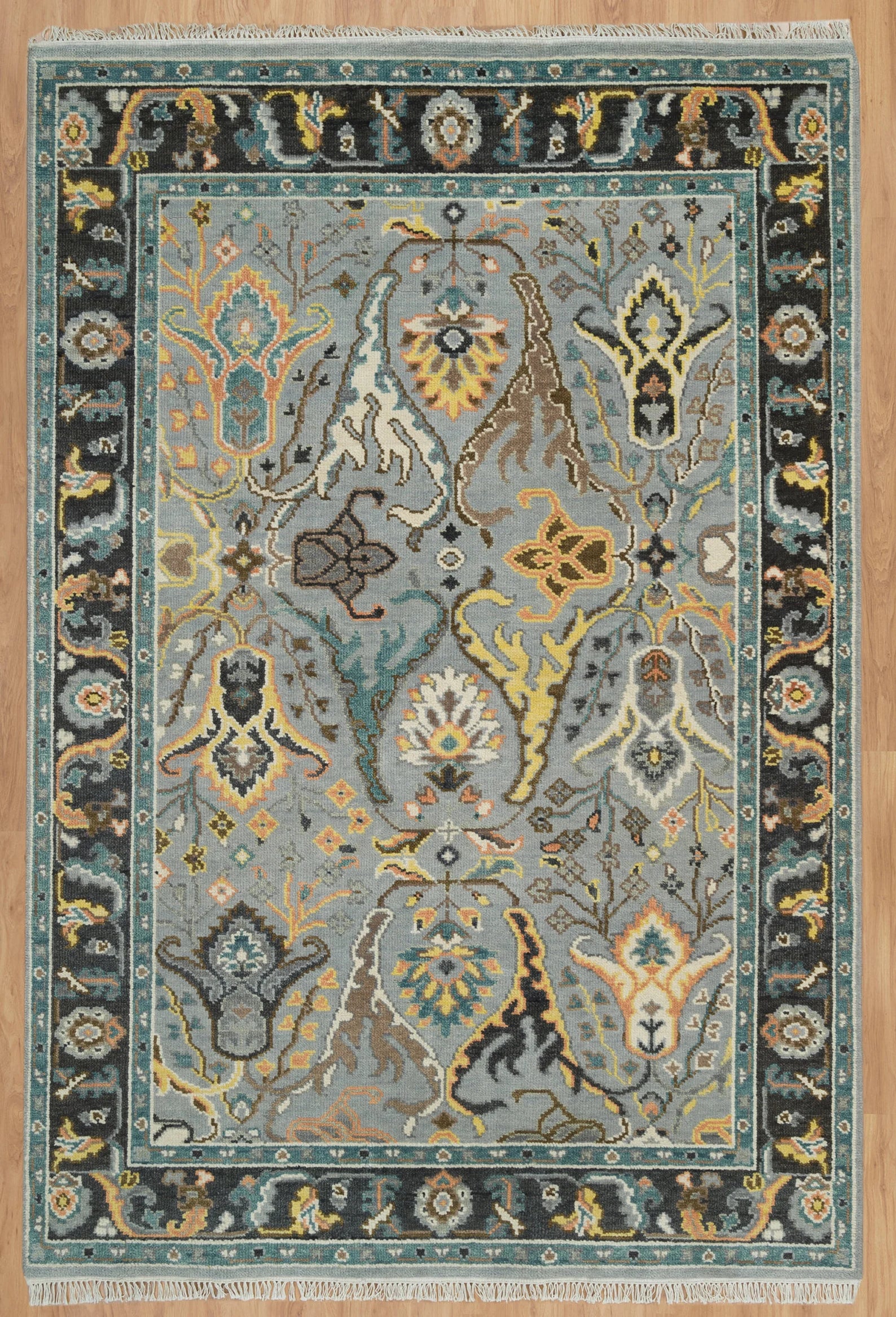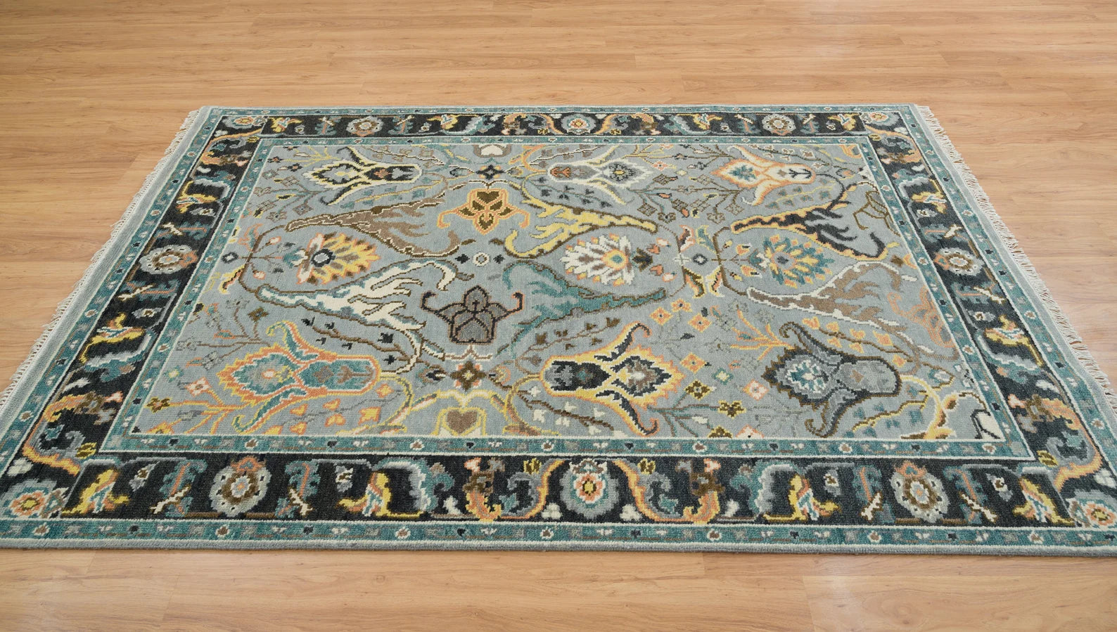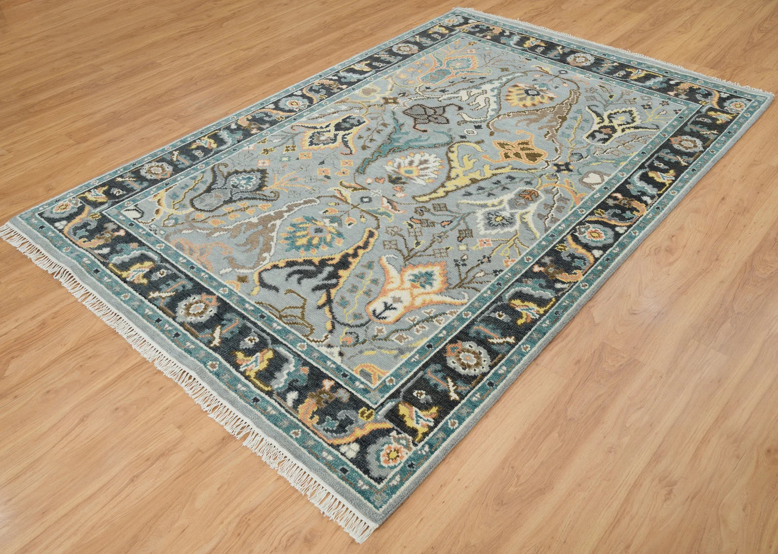 Fossil Gray Oushak Rug – Gold Accent Wool Area Rug | Teal, Ivory & Black Border Turkish Rug for Living Room or Bedroom