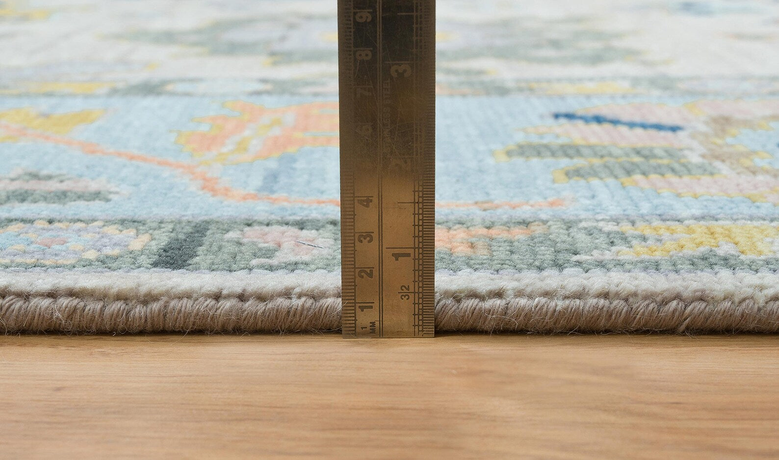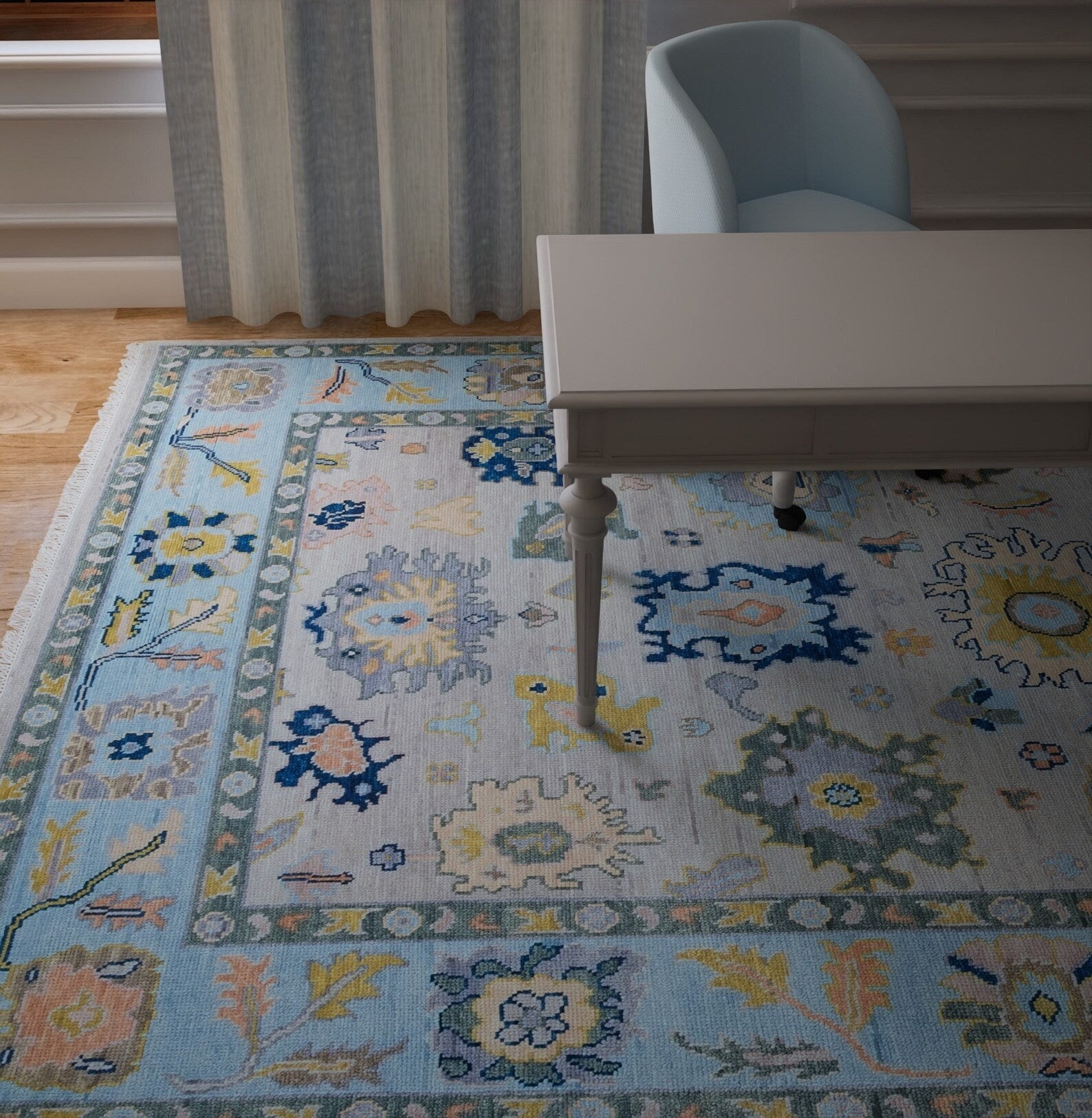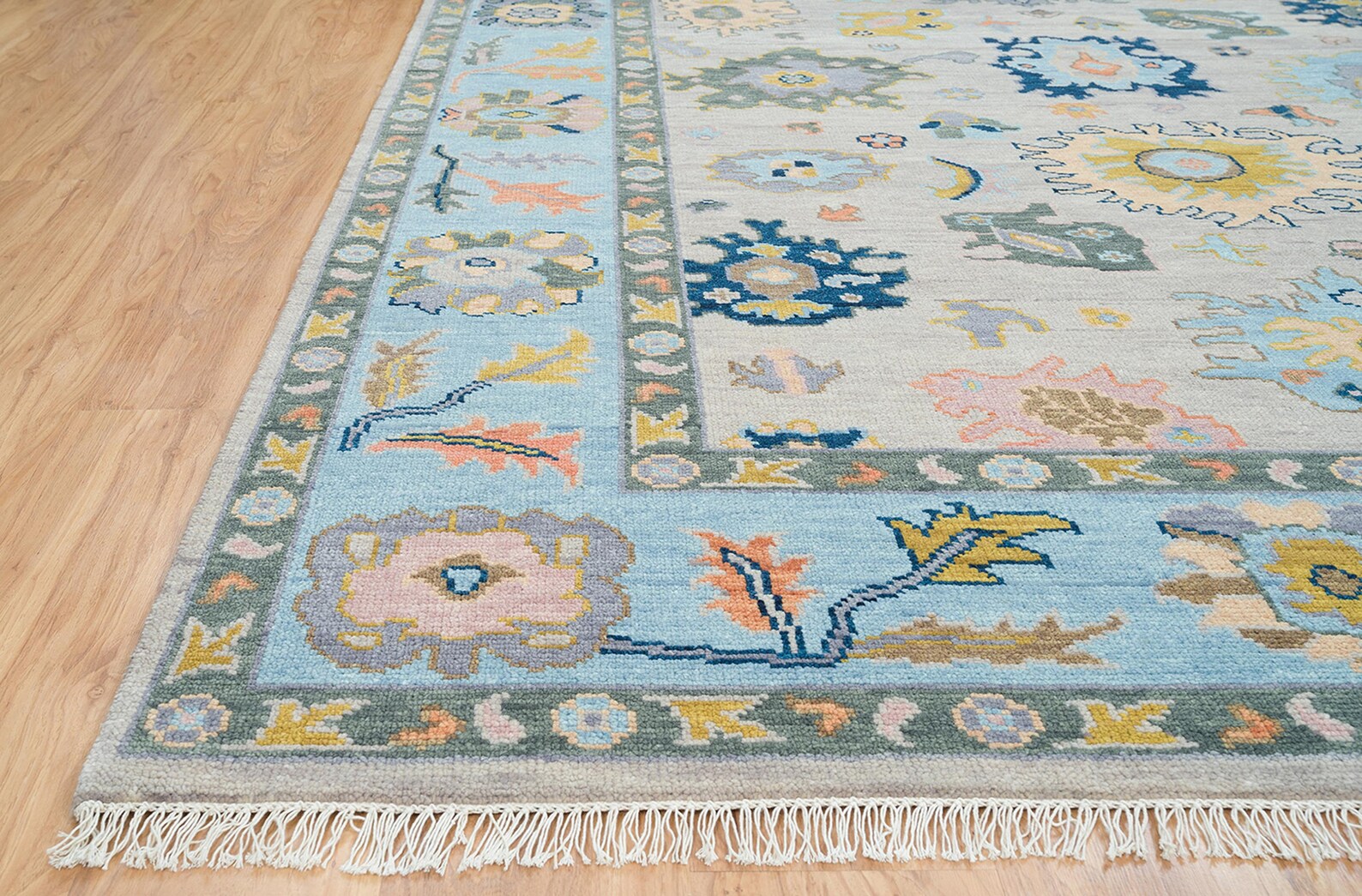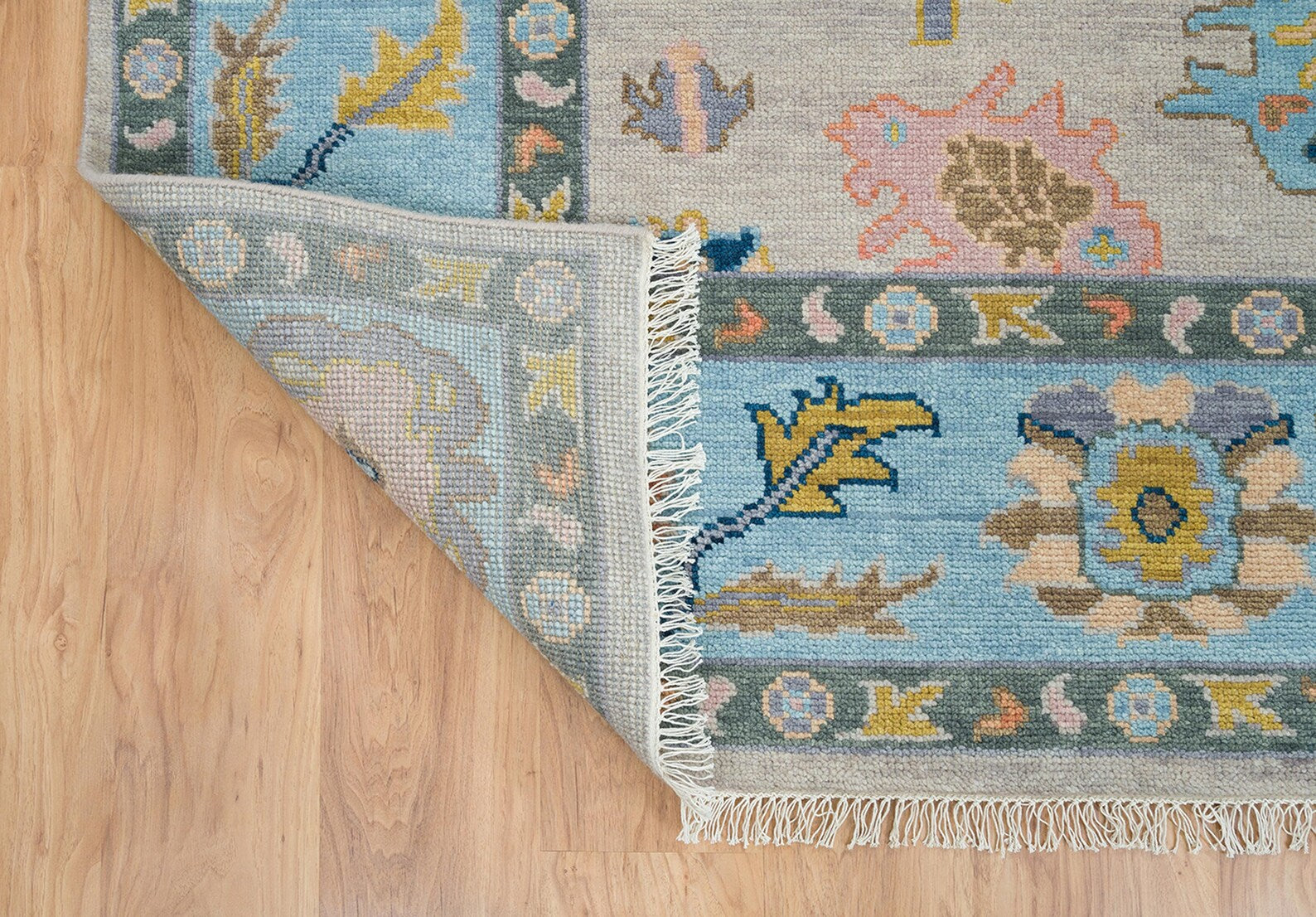Add color, character, and comfort to your space with this Gray & Blue Oushak Rug, beautifully hand-knotted from 100% premium wool in Turkey. Designed with a sophisticated gray and blue base, it comes to life through rich accents of gold, pink, and navy, offering a perfect mix of traditional charm and modern vibrance.