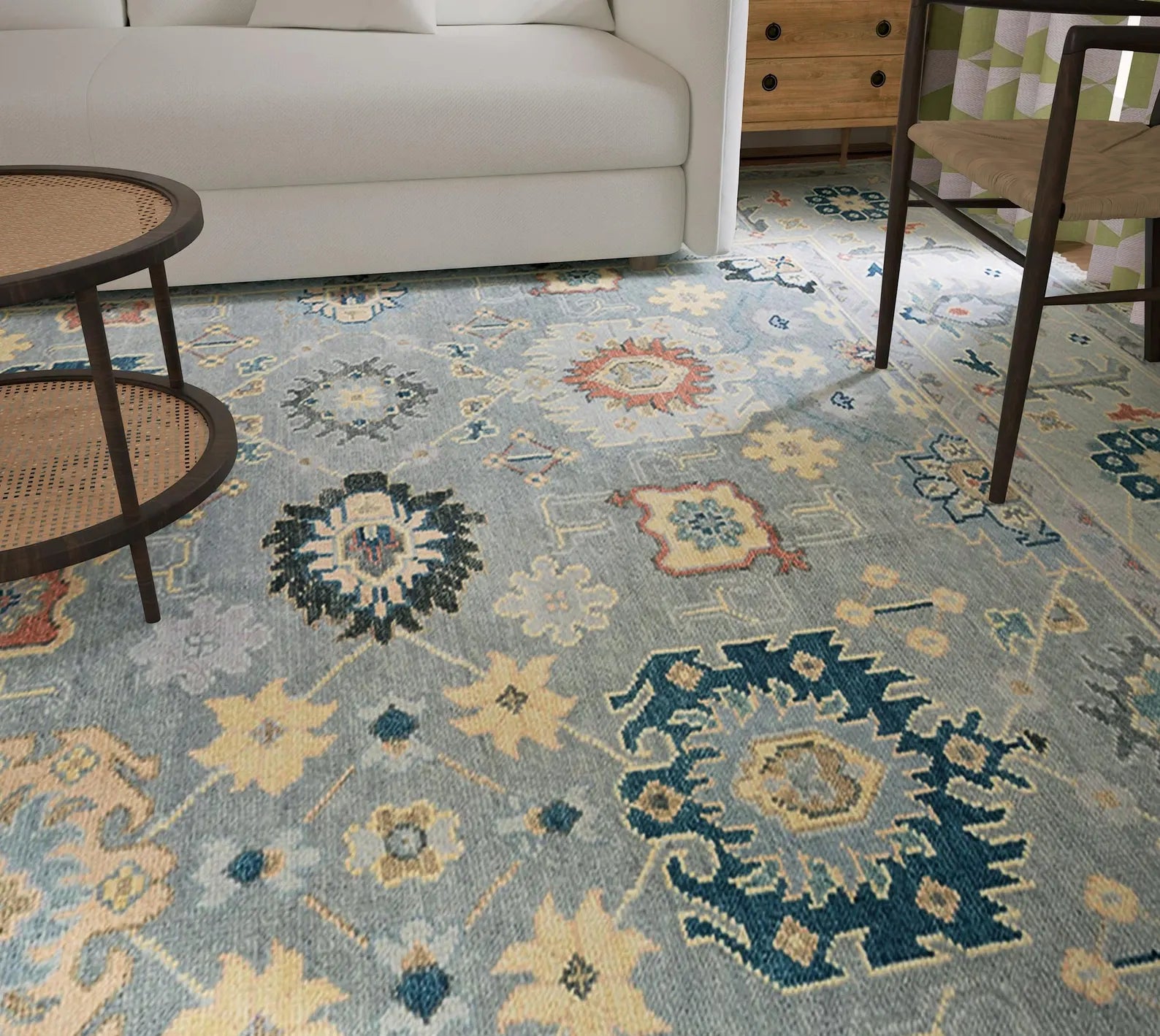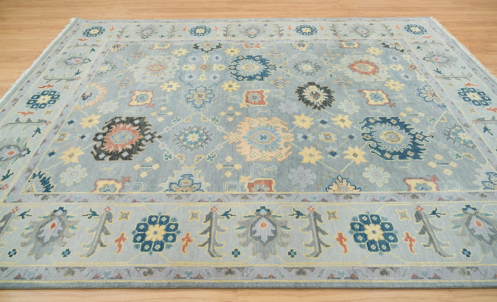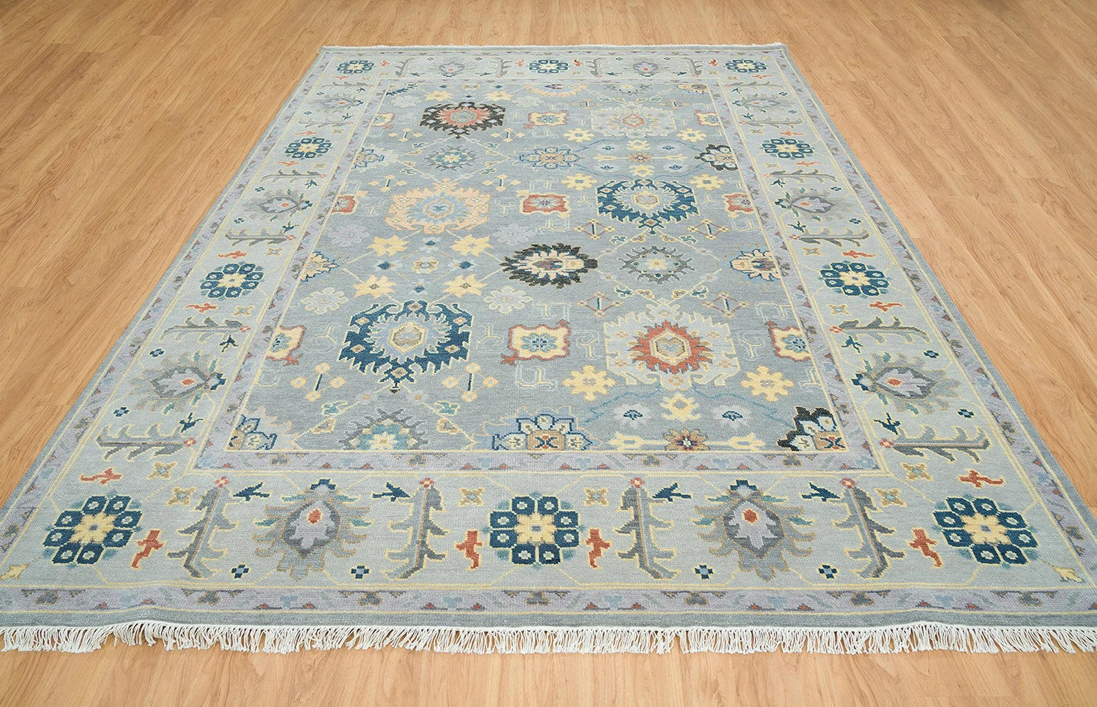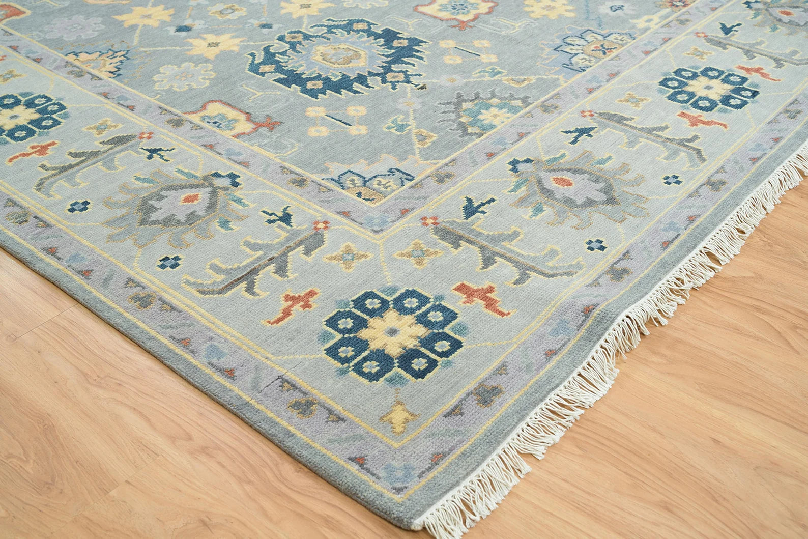 Graceful Tradition Meets Bold Color – Handmade Gray Oushak Rug with Floral Accents