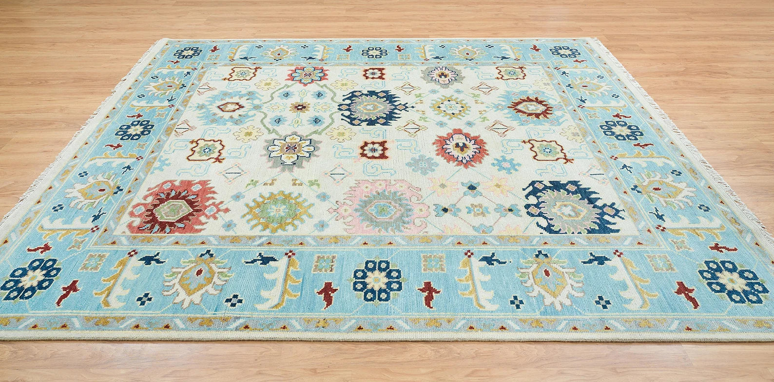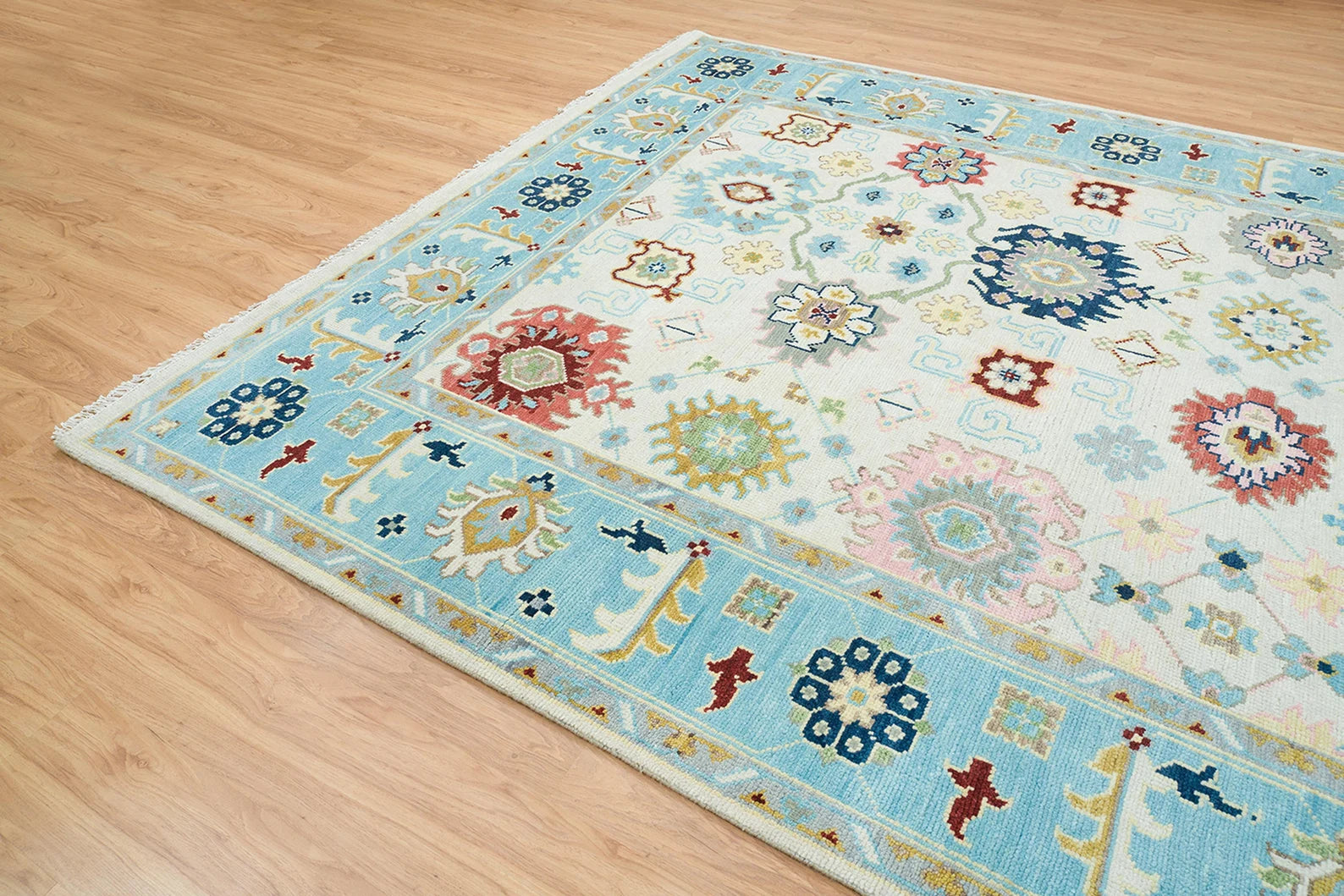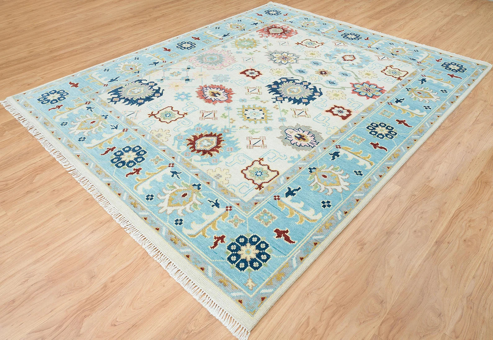 Ivory & Sky Blue Oushak Rug – Handmade Wool Area Rug | Large Colorful Modern Indoor Carpet for Living Room