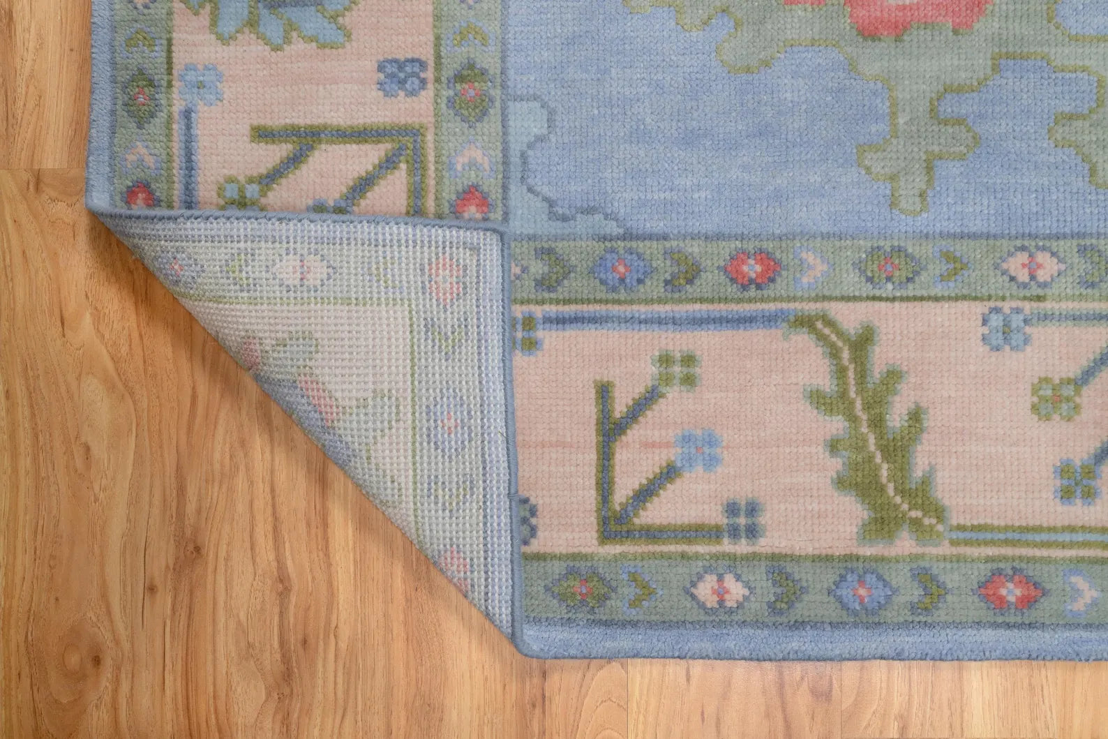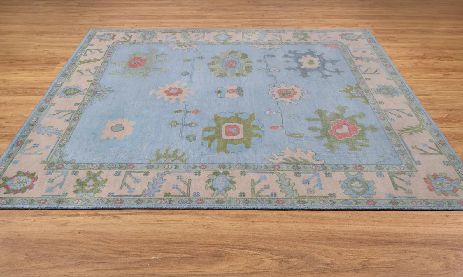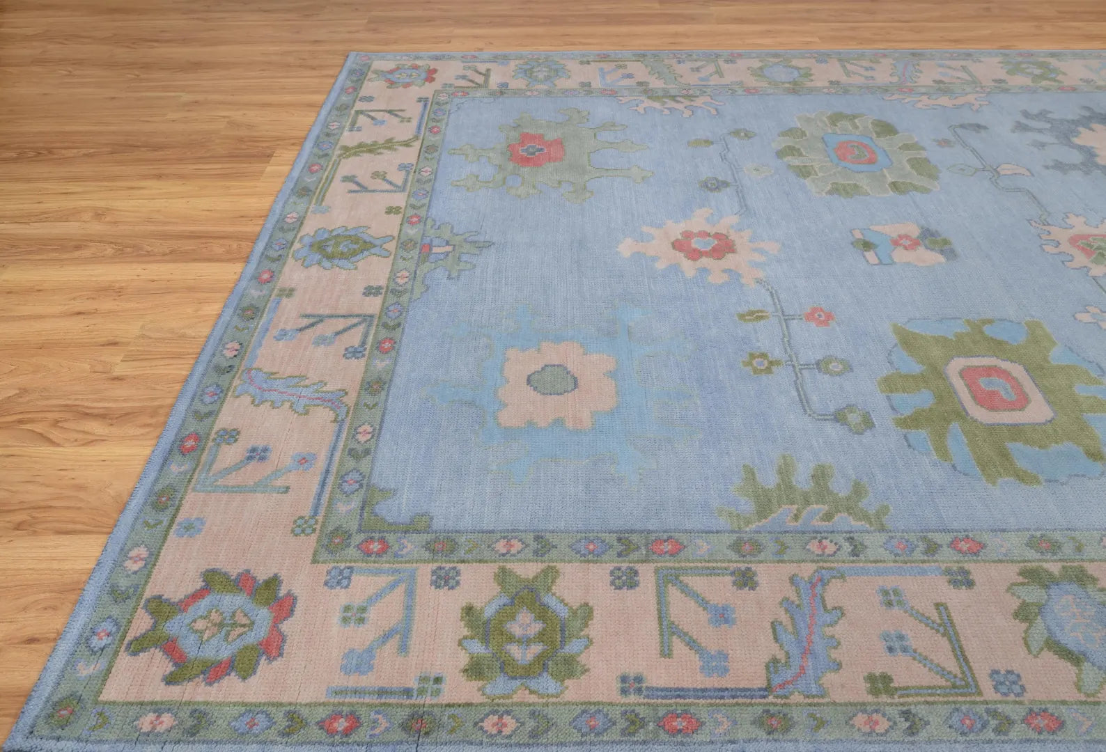 Delicate and timeless, this Pastel Oushak Rug is a hand-knotted Turkish wool masterpiece that blends classic floral motifs with a modern color palette. Featuring a soothing combination of light blue and soft green, accented with touches of pink and beige, this rug is designed to bring gentle warmth and elegance into your bedroom, nursery, or light-filled living room.