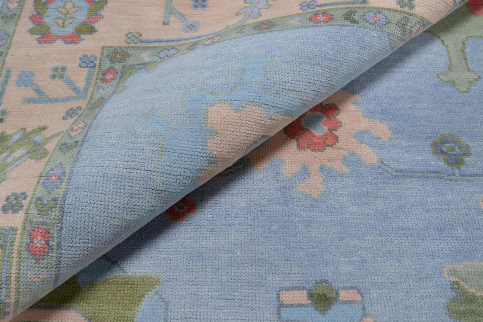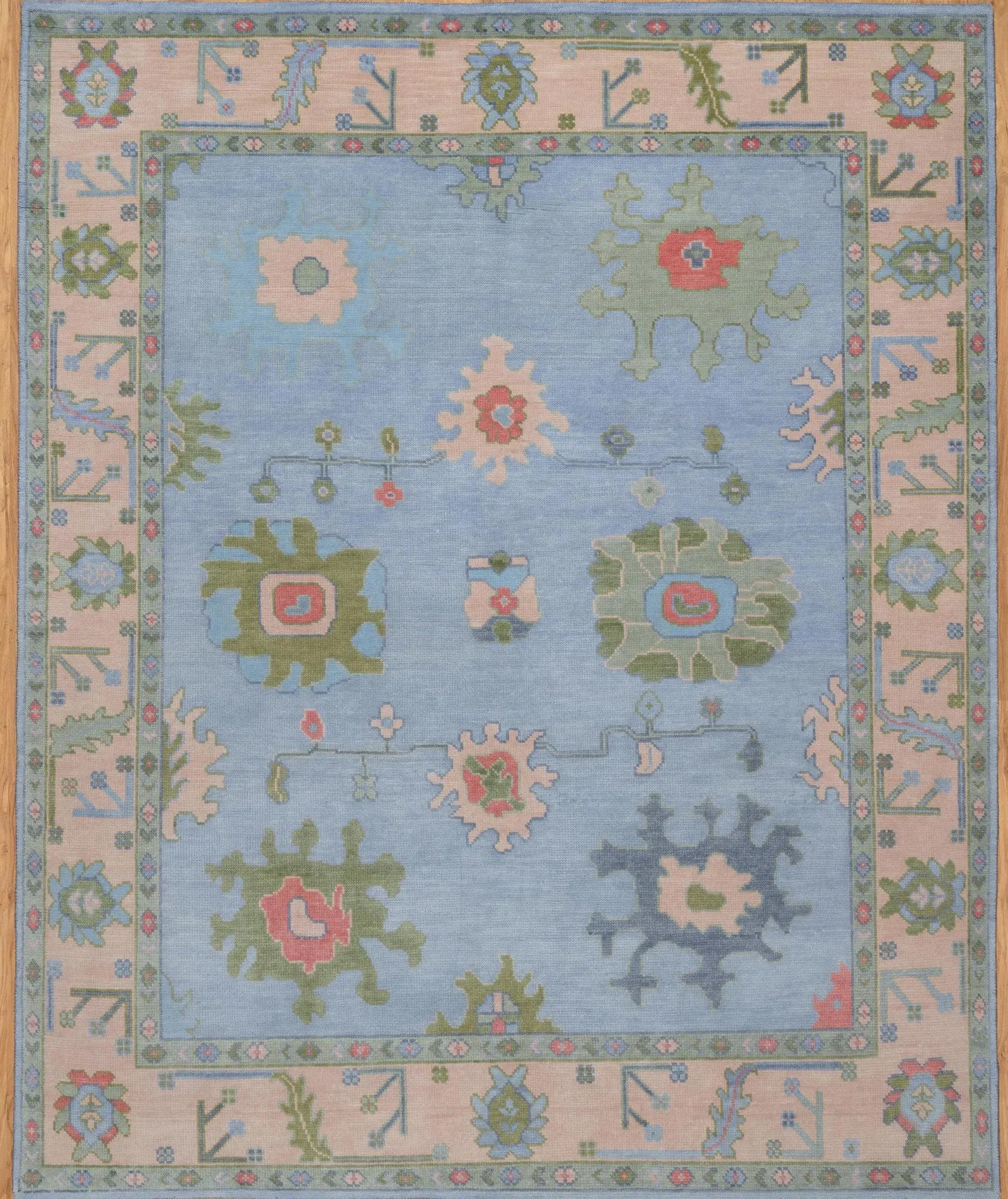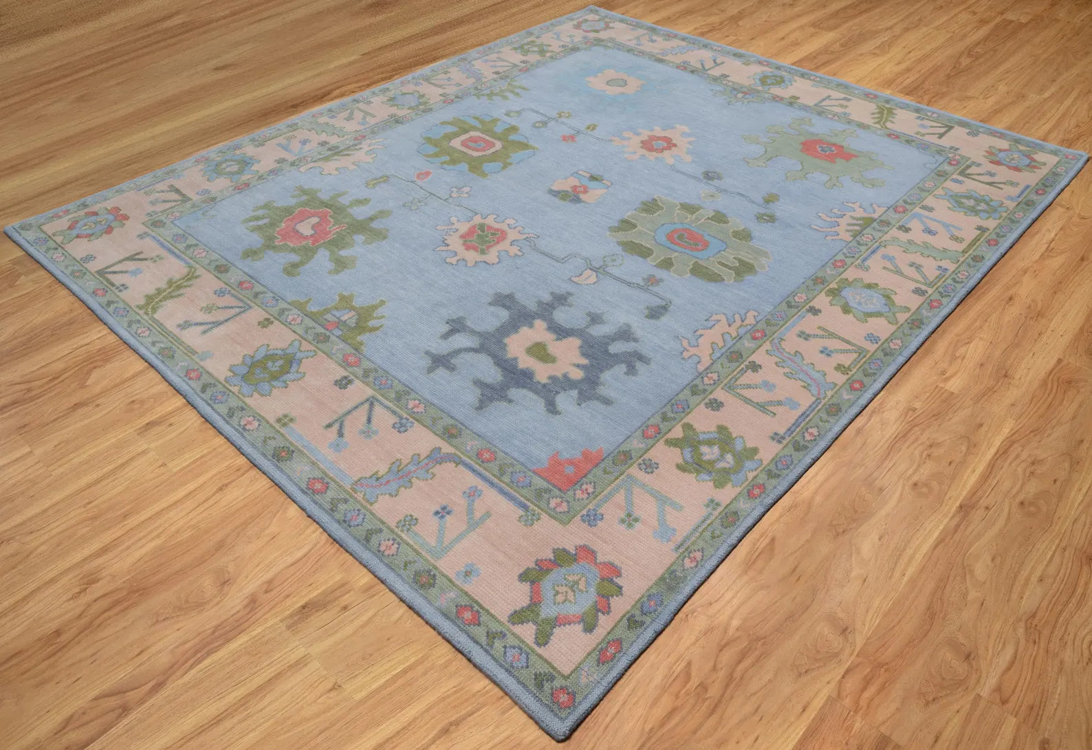 Delicate and timeless, this Pastel Oushak Rug is a hand-knotted Turkish wool masterpiece that blends classic floral motifs with a modern color palette. Featuring a soothing combination of light blue and soft green, accented with touches of pink and beige, this rug is designed to bring gentle warmth and elegance into your bedroom, nursery, or light-filled living room.