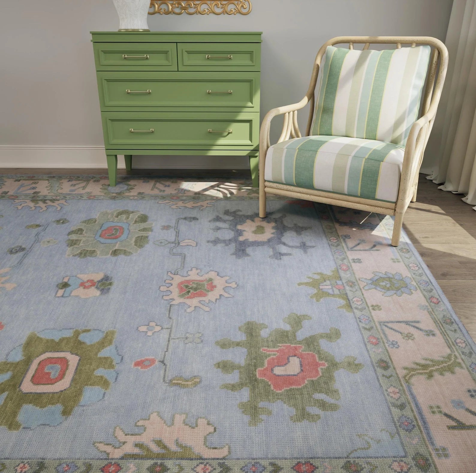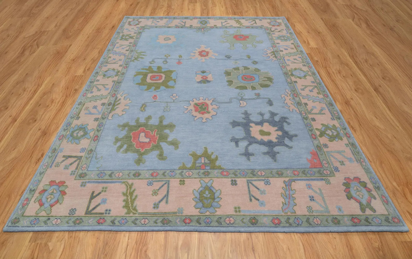 Light Blue Green Oushak Rug – Pastel Floral Wool Area Rug | Handmade Turkish Rug for Bedroom, Beige & Pink Accents