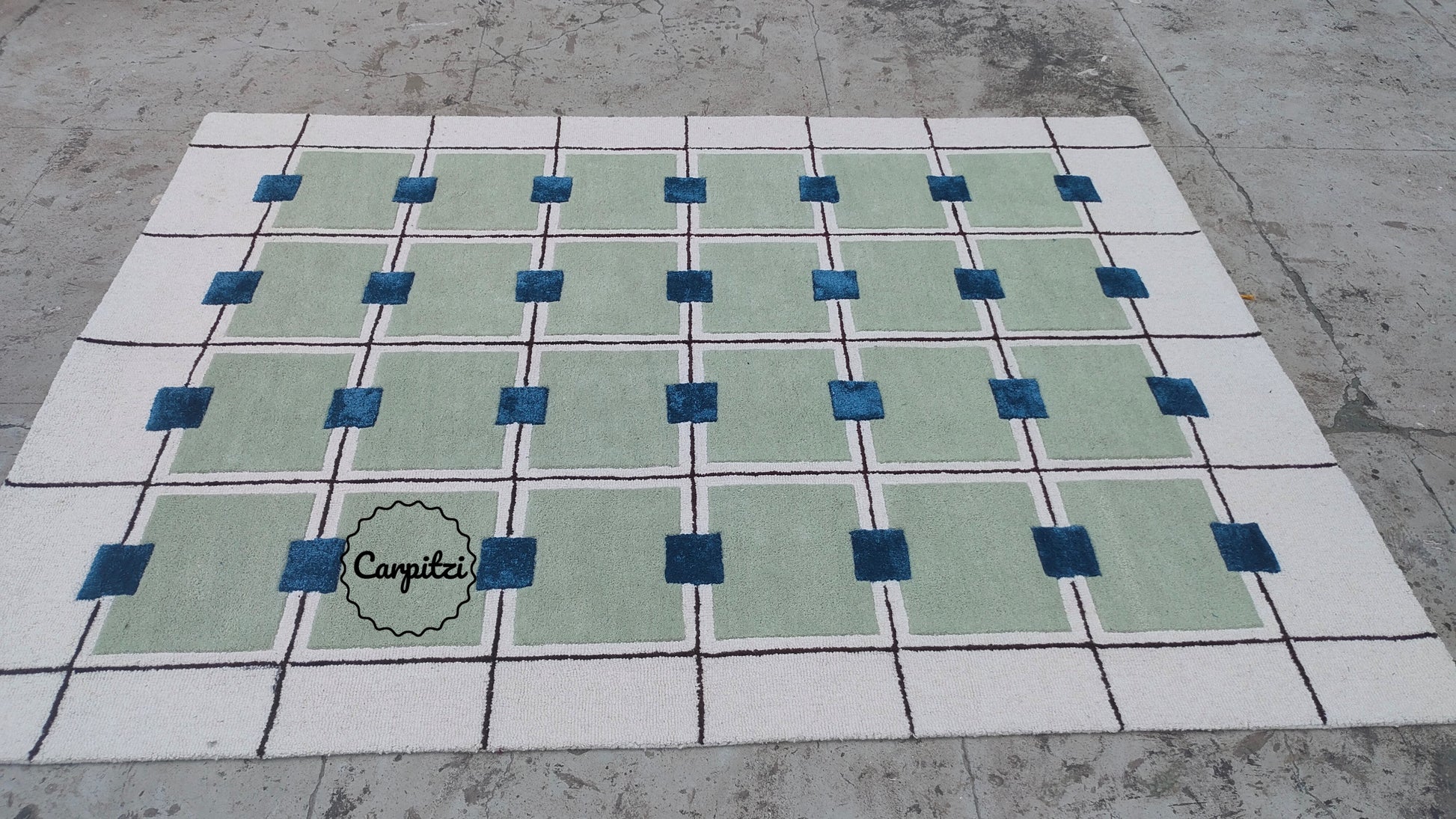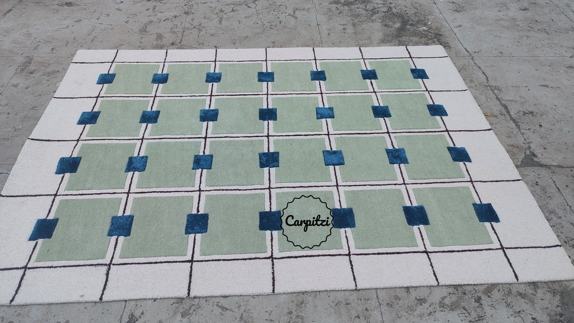 Modern Green Grid Tufted Rug – Geometric Blue & Cream Wool Carpet for Living Room
