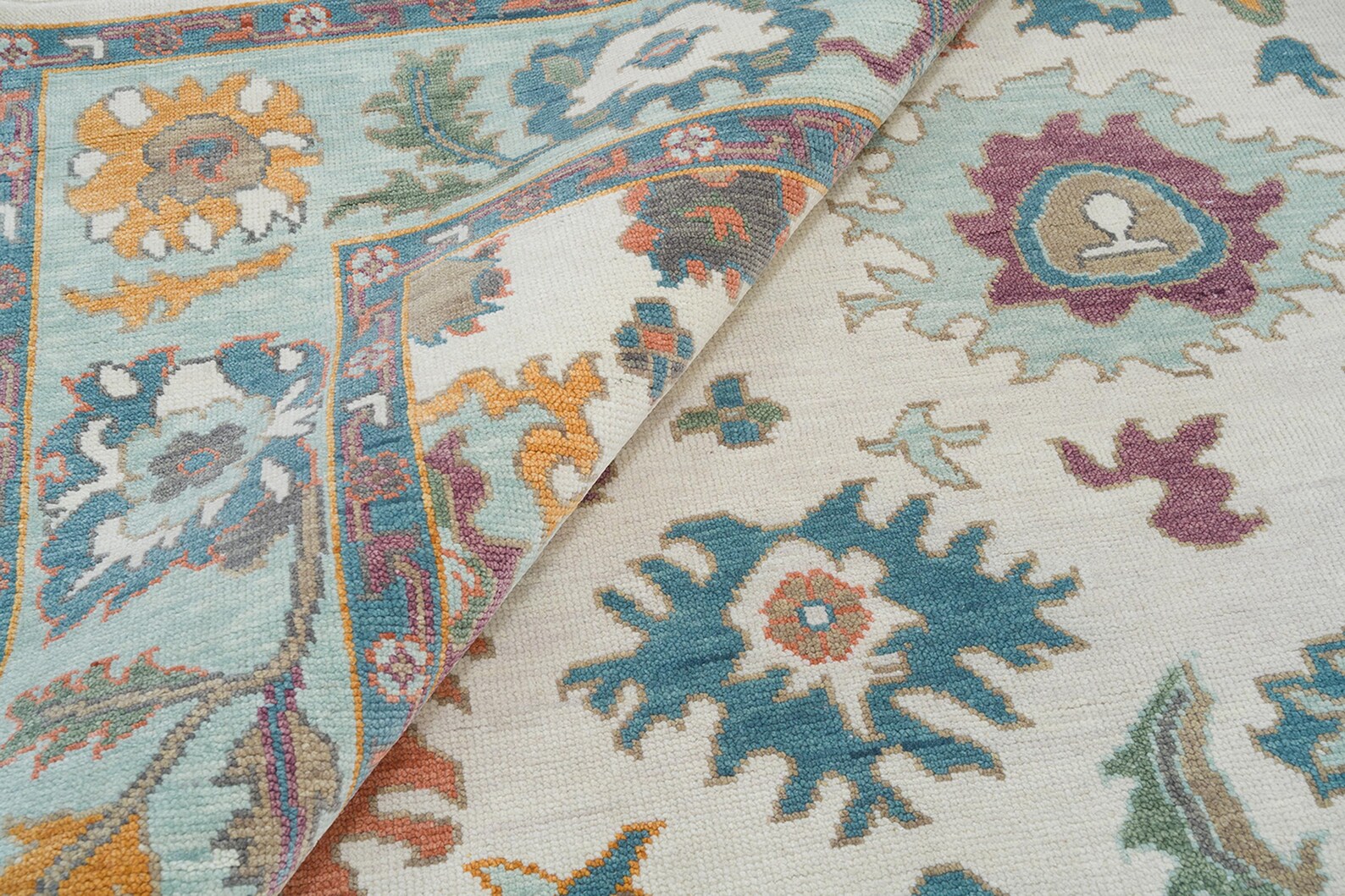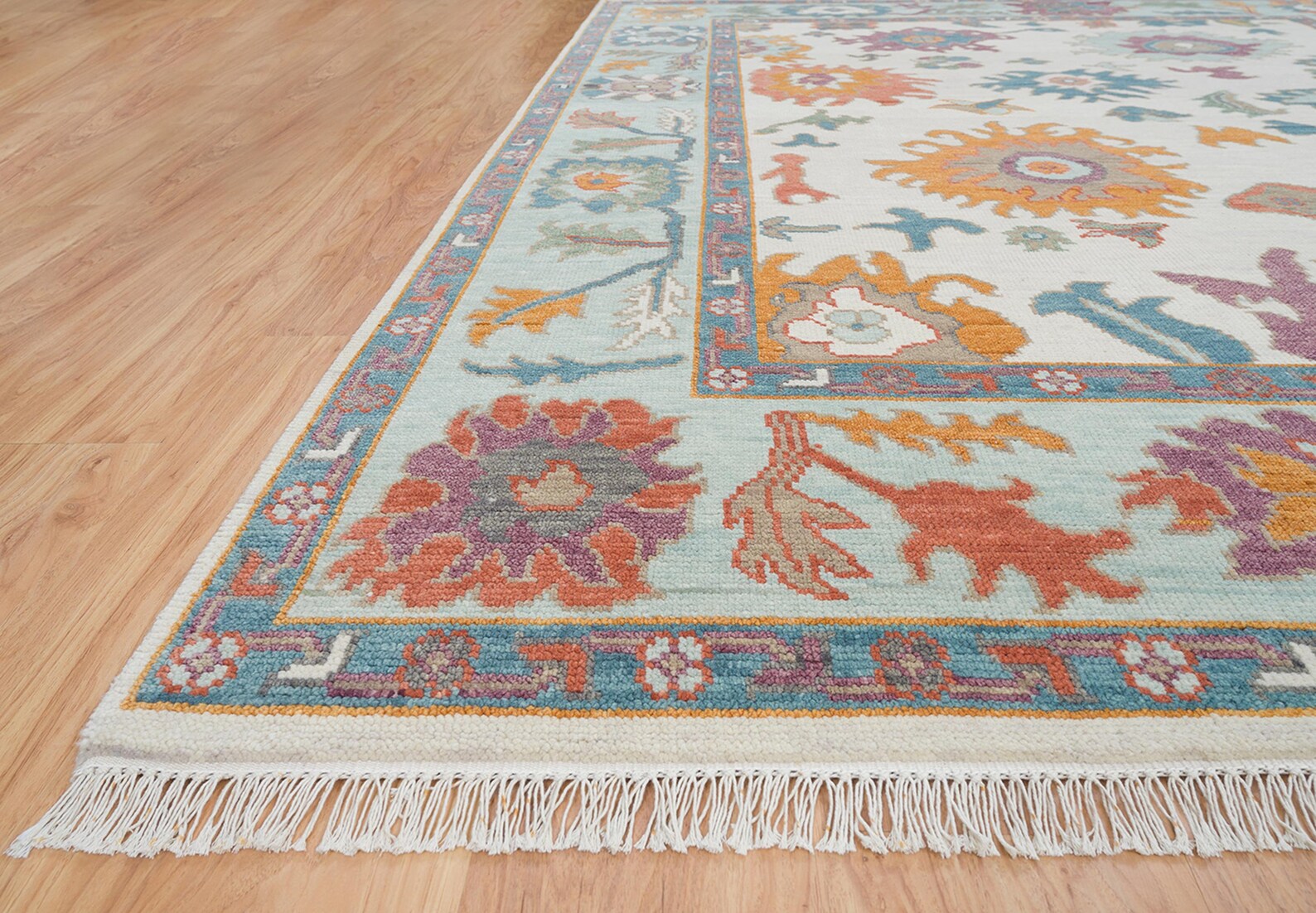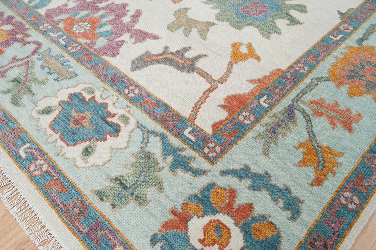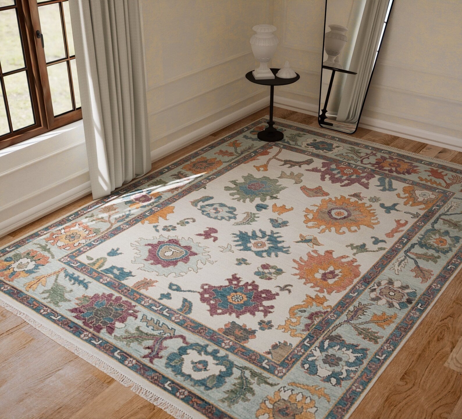 Bring fresh energy and timeless craftsmanship into your space with this Ivory Oushak Rug, featuring a soothing mint green border and hints of soft, colorful abstract detailing. Hand-knotted in Turkey from 100% high-quality wool, this rug blends traditional Oushak motifs with a modern minimalist palette, making it a standout piece for any living room, dining area, or bedroom.