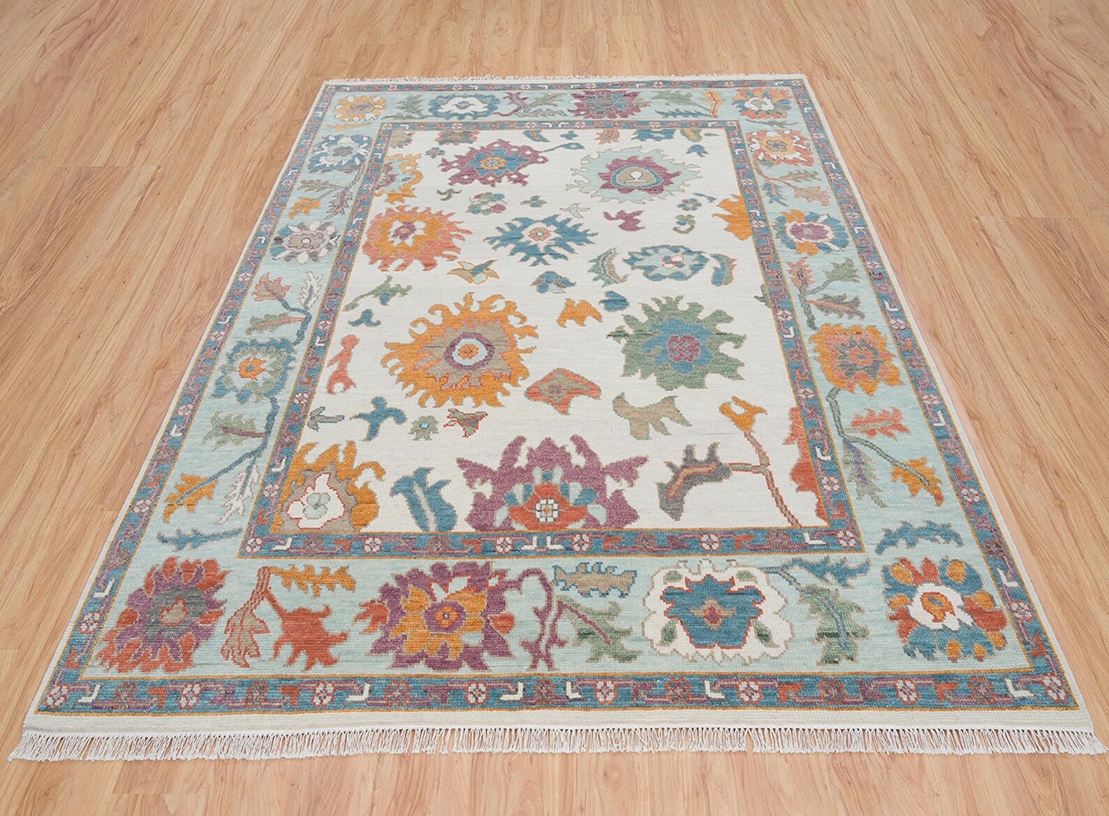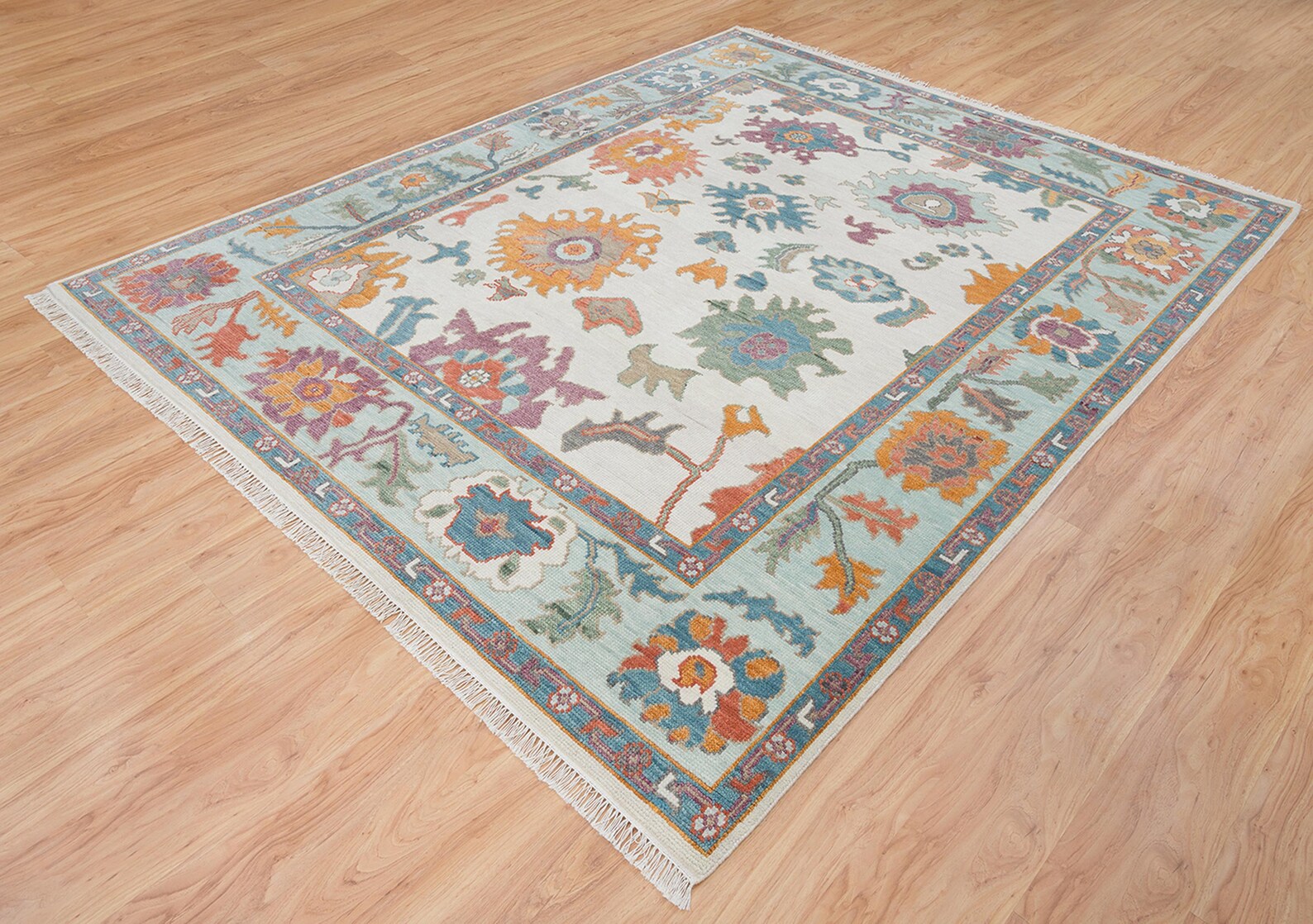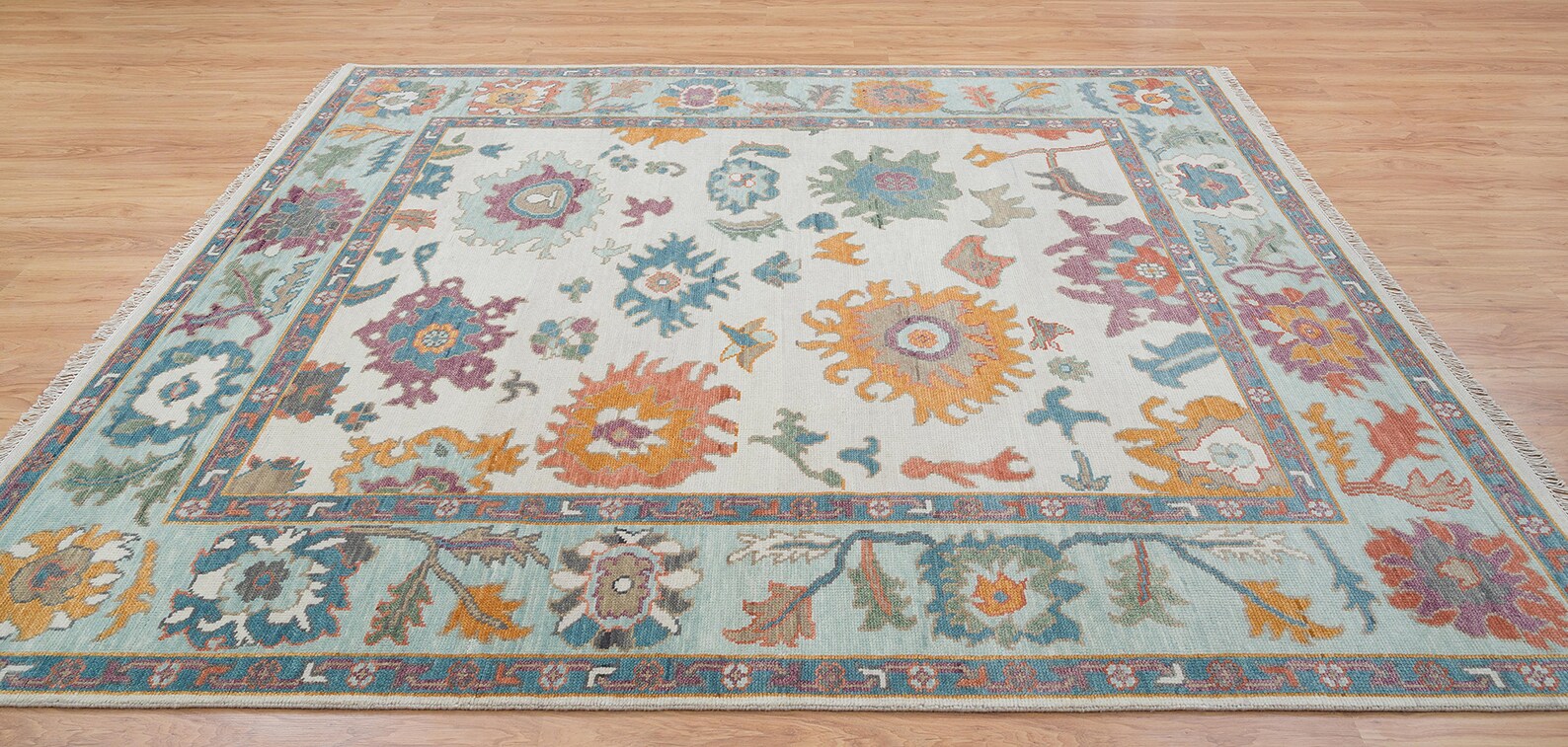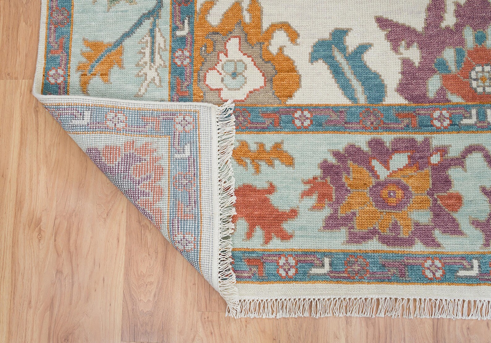 Bring fresh energy and timeless craftsmanship into your space with this Ivory Oushak Rug, featuring a soothing mint green border and hints of soft, colorful abstract detailing. Hand-knotted in Turkey from 100% high-quality wool, this rug blends traditional Oushak motifs with a modern minimalist palette, making it a standout piece for any living room, dining area, or bedroom.