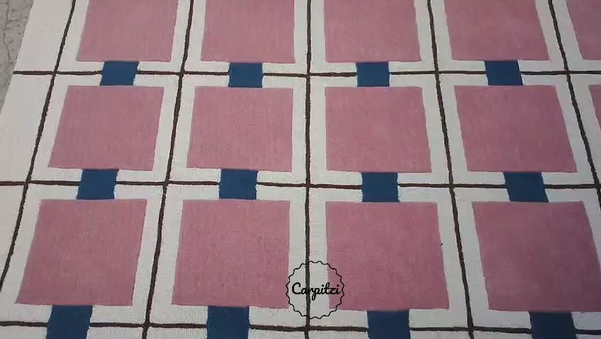 Introduce modern elegance to your space with this Modern Pink Grid Tufted Rug, featuring a charming arrangement of pastel pink squares framed by a clean geometric grid. Hand-tufted with luxurious New Zealand wool, this rug blends softness, durability, and contemporary style—perfect for living rooms, bedrooms, or creative studio spaces. The contrasting blue accents and warm brown grid lines add a bold yet balanced touch, making it a standout piece in any interior.