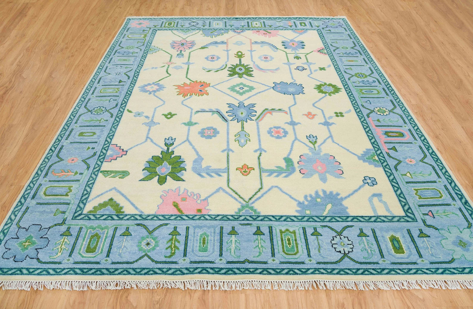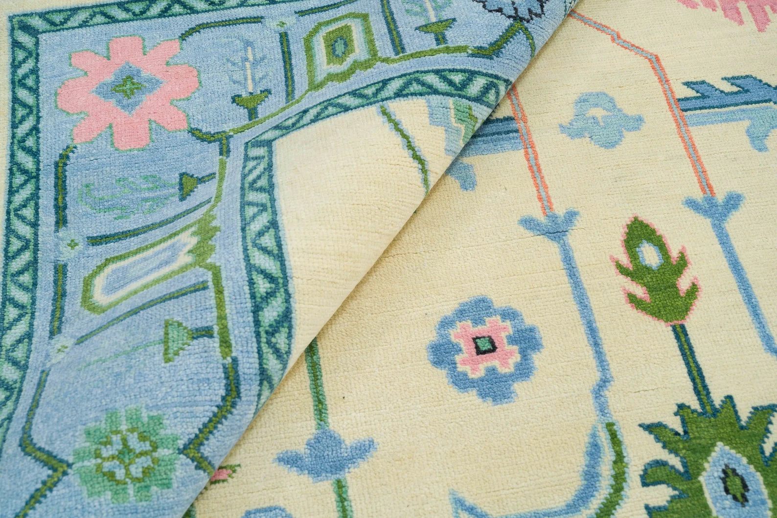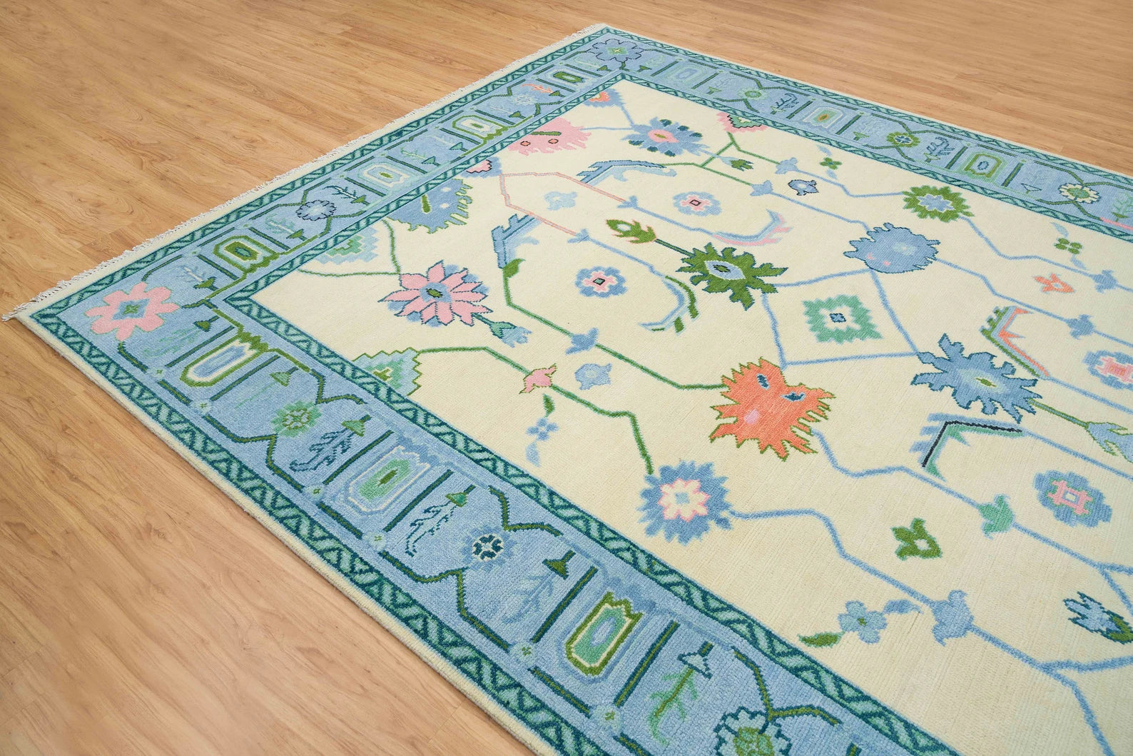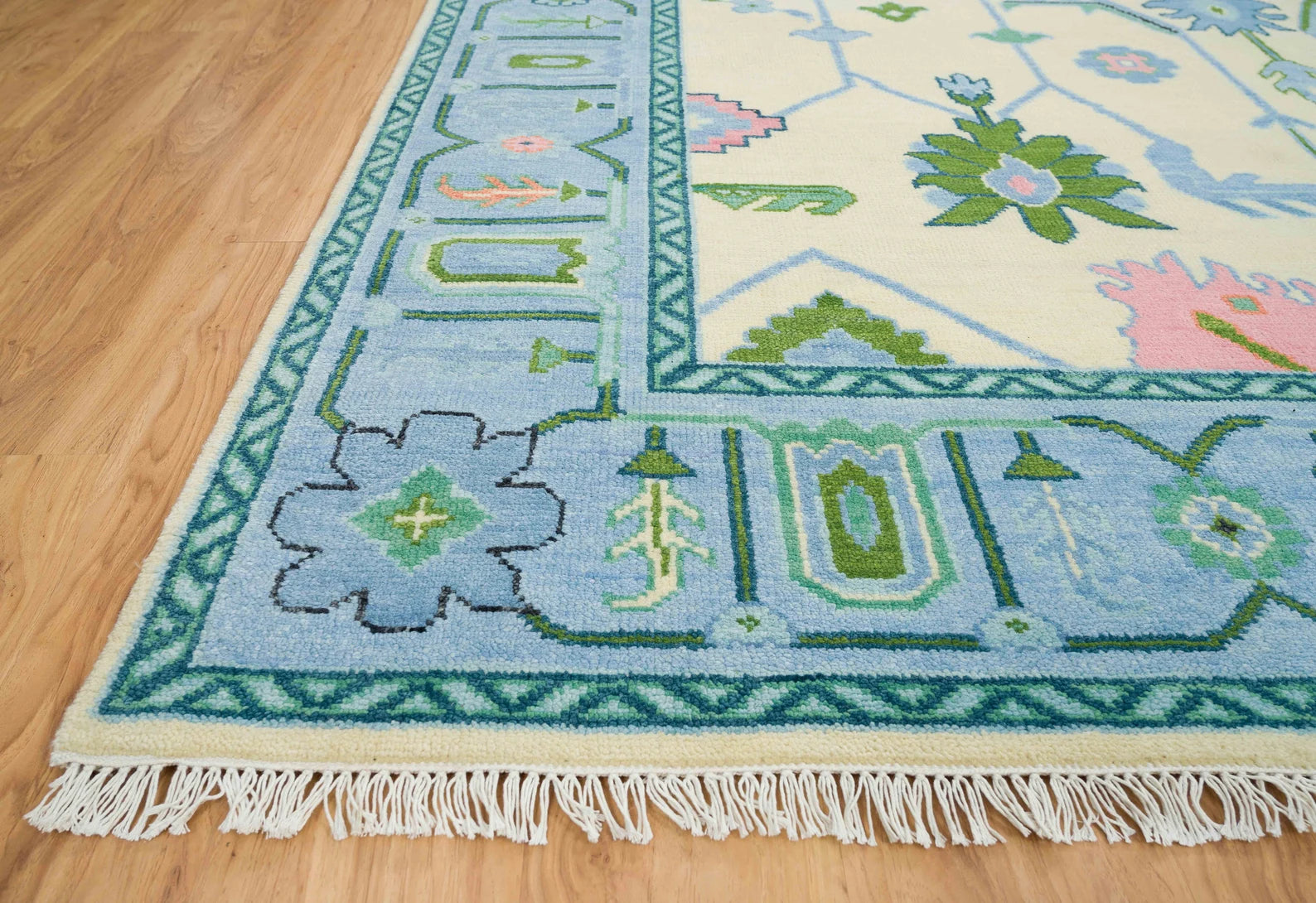 Oushak Rug – Cream, Blue & Green with Pink Accents | Modern Abstract Turkish Wool Rug | Handknotted Bedroom Area Carpet