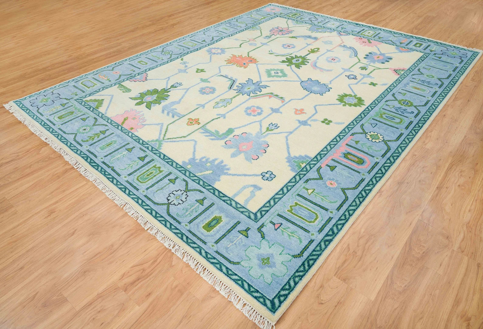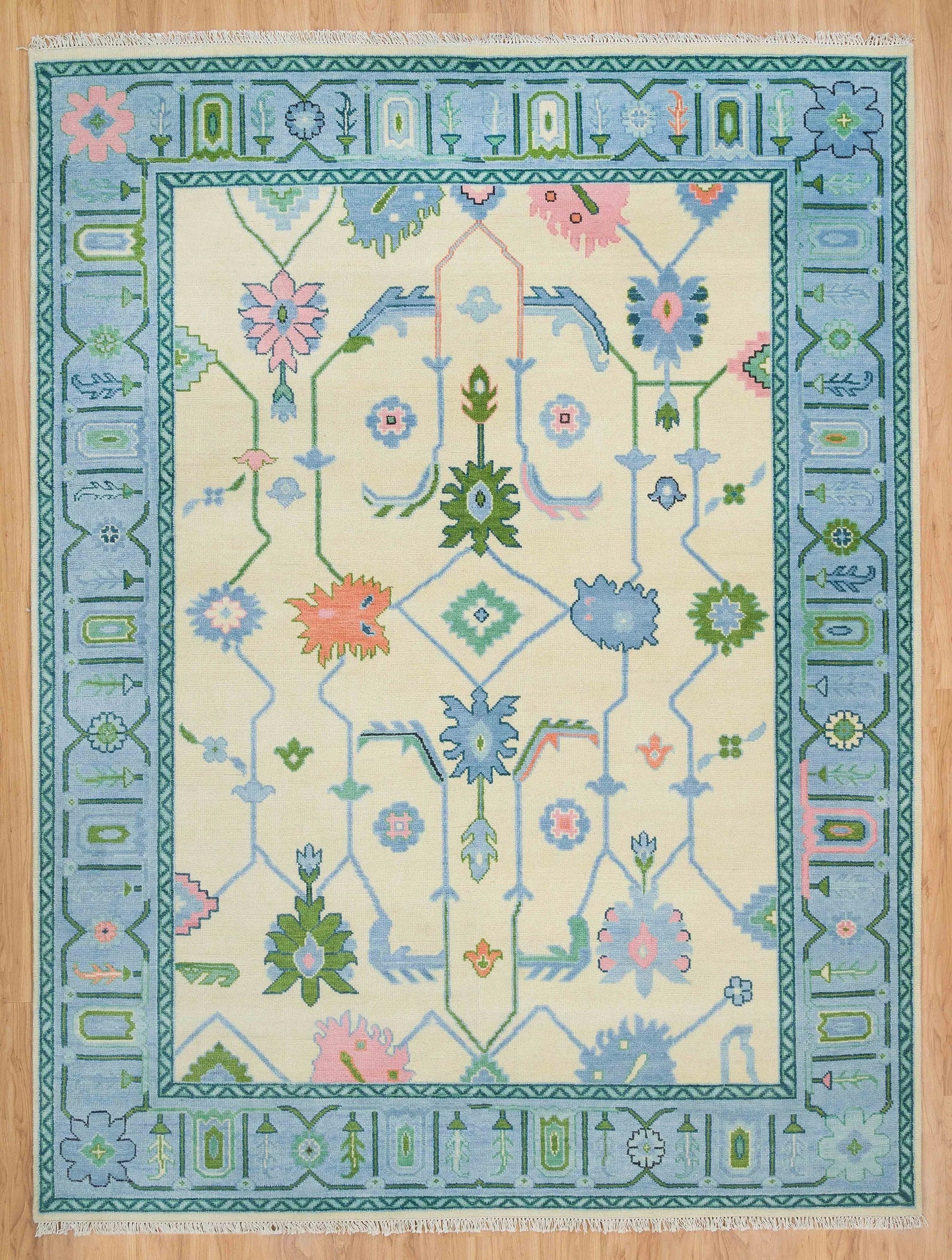 Bring warmth, texture, and timeless elegance to your home with this stunning Light Blue Oushak Rug, available in both 8x10 and 9x12 sizes. Hand knotted in Turkey using premium wool, this one-of-a-kind area rug blends traditional craftsmanship with a modern, colorful palette featuring ivory, pink, green, and navy tones.