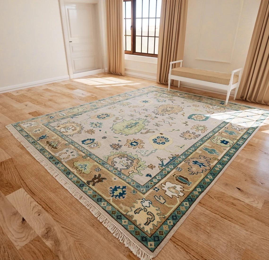 Modern Ivory Oushak Rug – Mint Green Border Wool Rug | Abstract Turkish Area Rug 8x10 / 9x12 for Living Room or Bedroom